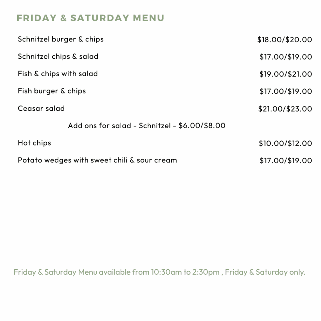 Friday & Saturday Menu available from 10:30am to 2:30pm , Friday & Saturday only.